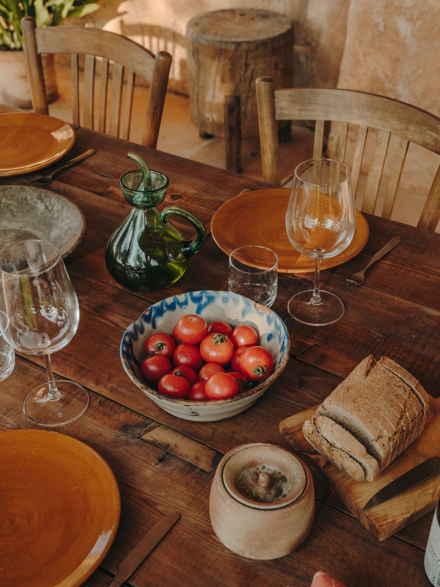 Spezielle Handtücher aus schwerer Baumwolle für Bäder und den Poolbereich, Bettwäsche aus hochwertiger Baumwolle, Tischwäsche aus Leinen, Teller und Geschirr aus Terrakotta.