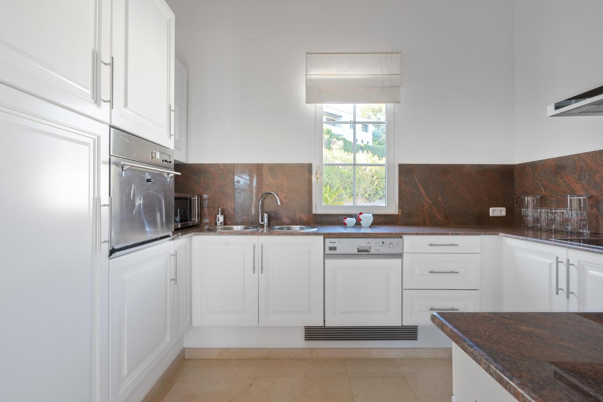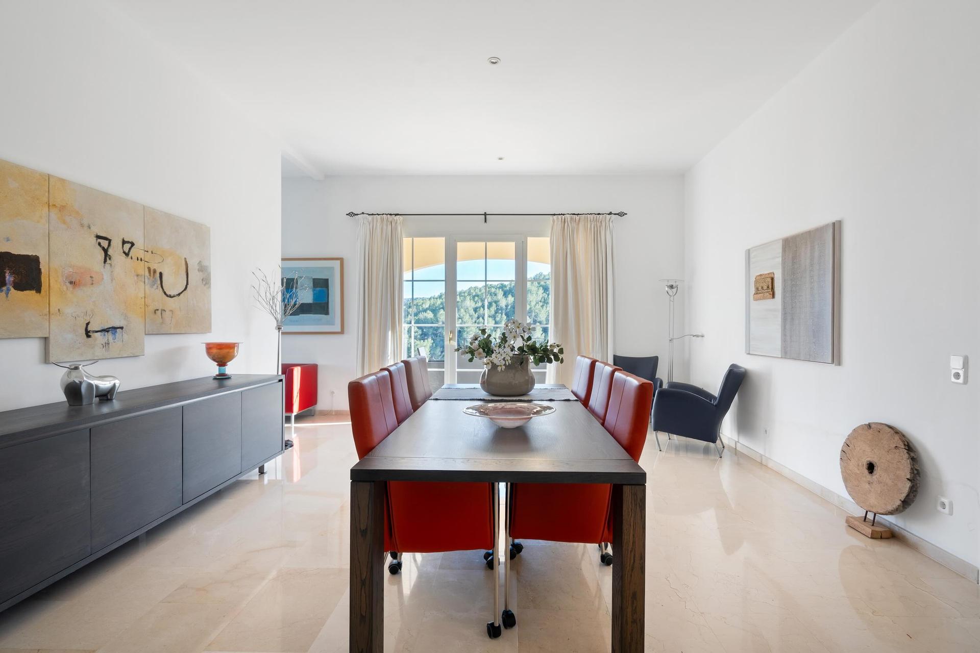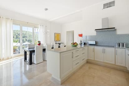 Diseñada para combinar comodidad y estilo, la villa es ideal para familias o grupos. En la planta baja, la cocina de lujo totalmente equipada incluye electrodomésticos de alta gama y una despensa contigua para mayor funcionalidad. Grandes ventanales de suelo a techo enmarcan el impresionante paisaje exterior, mientras que las terrazas y jardines ofrecen espacios perfectos para relajarse al aire libre. La terraza central, amplia y soleada, cuenta con una piscina de 12 x 6 metros, bar en la piscina, cómodas tumbonas y una zona chill-out con asientos relajantes. Además, la calefacción por suelo radiante y el aire acondicionado garantizan el máximo confort durante todo el año.
