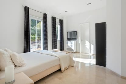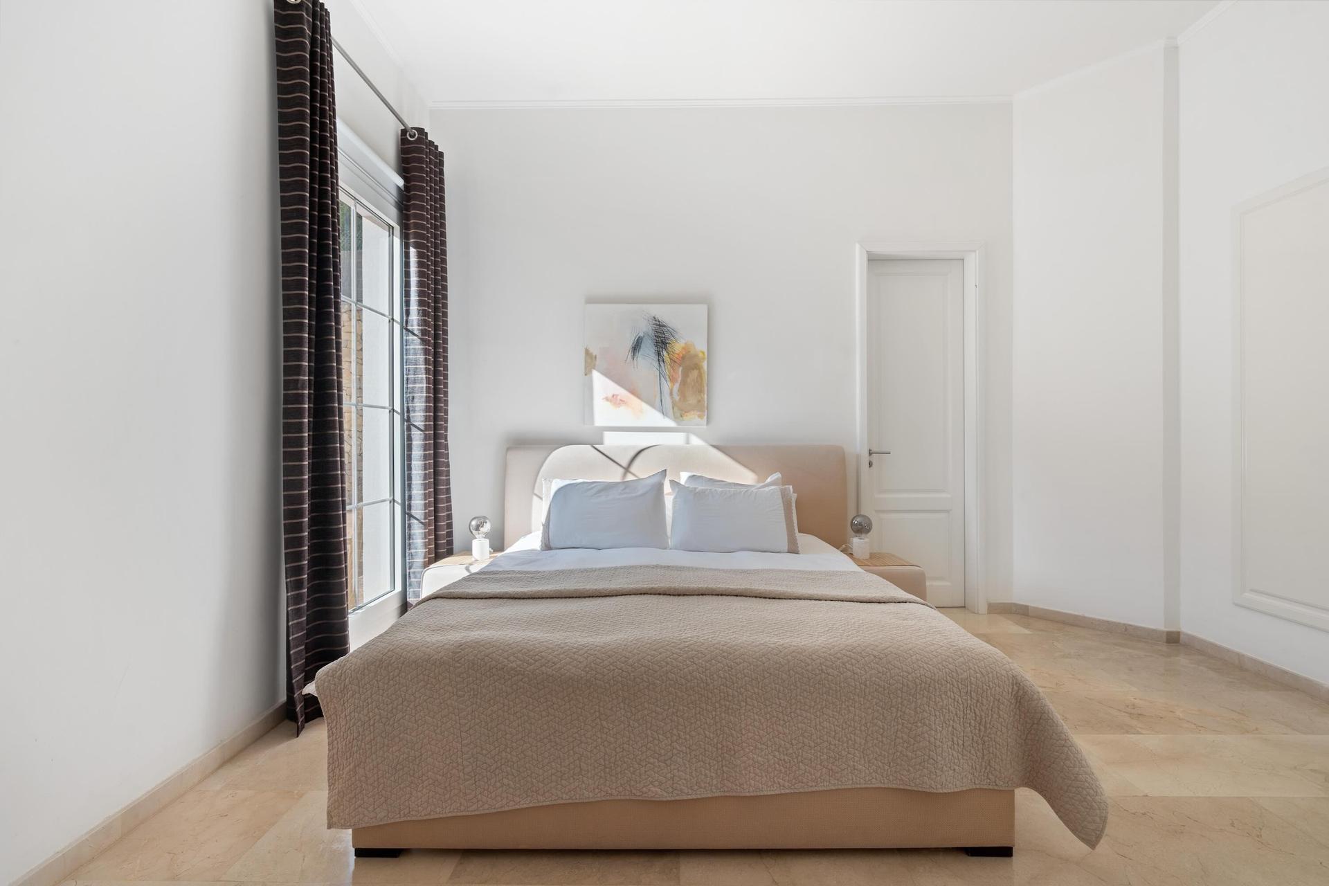 También en la primera planta se encuentra la gran suite principal, que destaca por su amplio vestidor, ducha efecto lluvia de gran tamaño, baño de vapor y bañera independiente. El dormitorio principal de Villa Morice es un verdadero santuario de confort, con acceso directo a una terraza privada con vistas