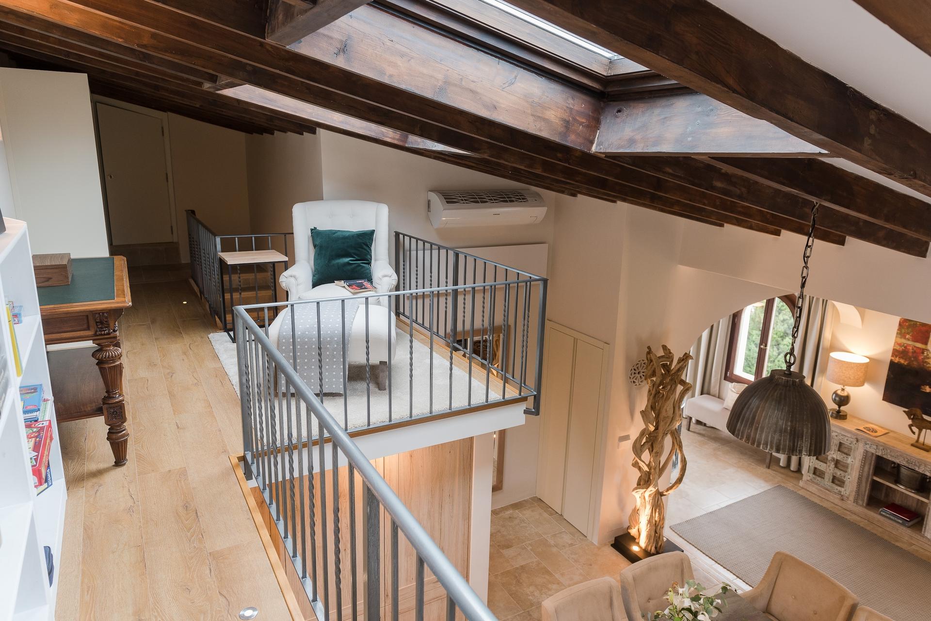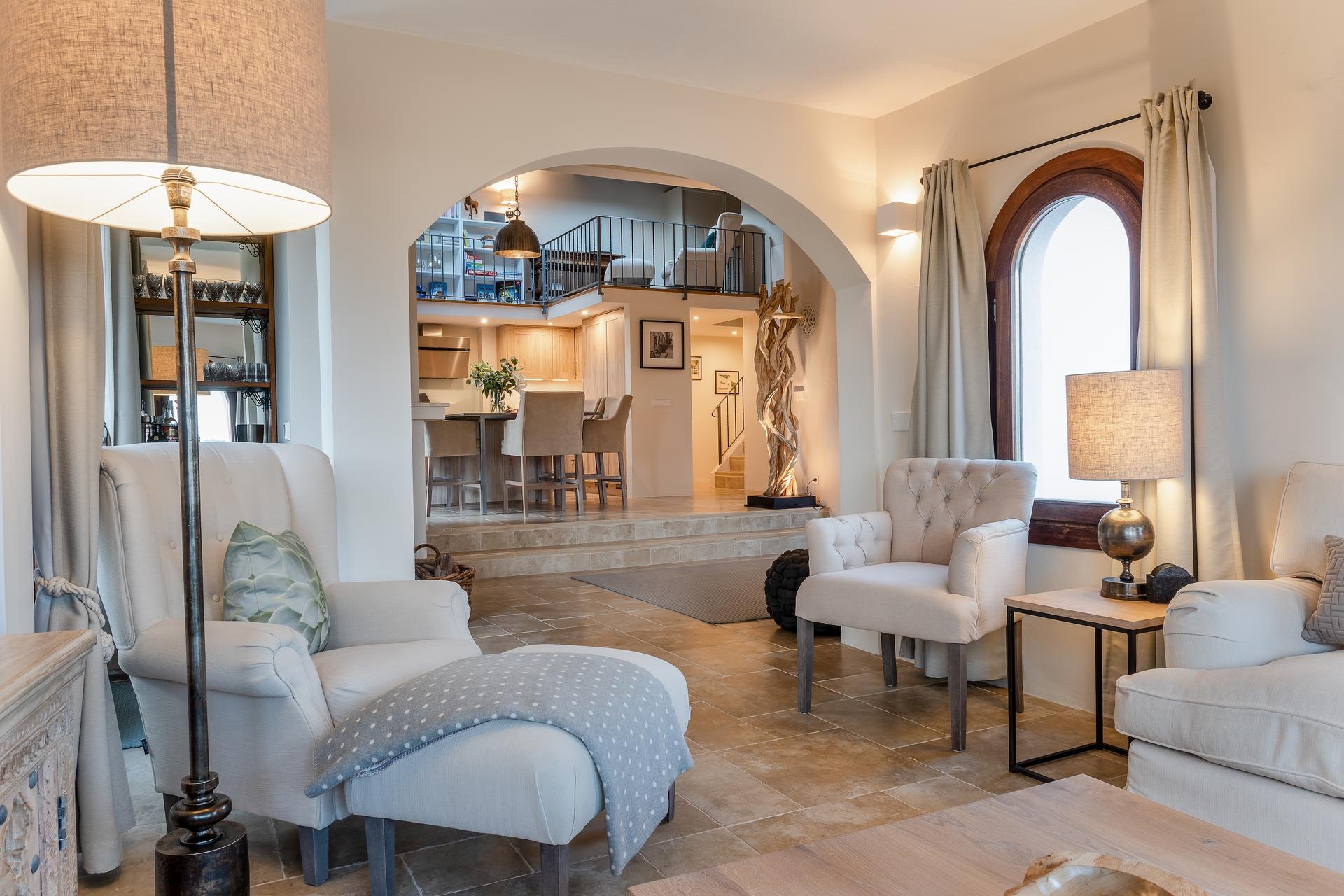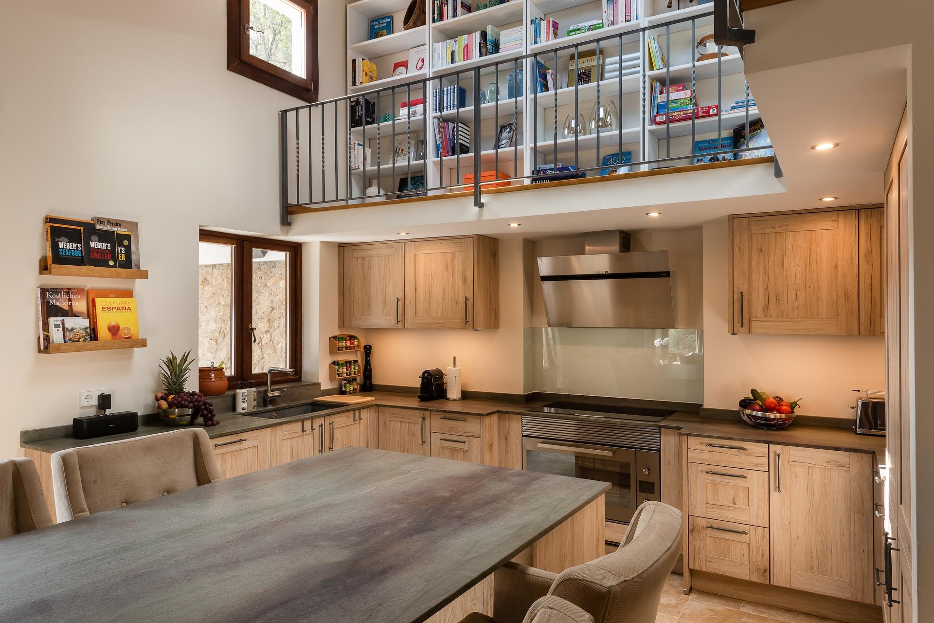 At the heart of the villa lies the open-plan kitchen and dining area, fully equipped with high-end appliances and everything needed for a gourmet experience. The dining table comfortably seats eight, while in the tower annex there is a cozy lounge with a fireplace. A mezzanine library accessed by stairs provides an inviting space to unwind and enjoy quiet leisure time. The adjacent, partially covered terrace invites you to savour al fresco dining bathed in the golden light of the Tramuntana mountains, while a more private outdoor corner with a barbecue and additional seating provides the perfect setting for relaxed moments or convivial gatherings.