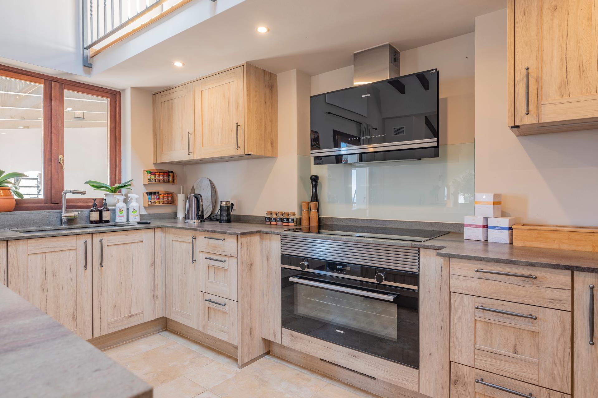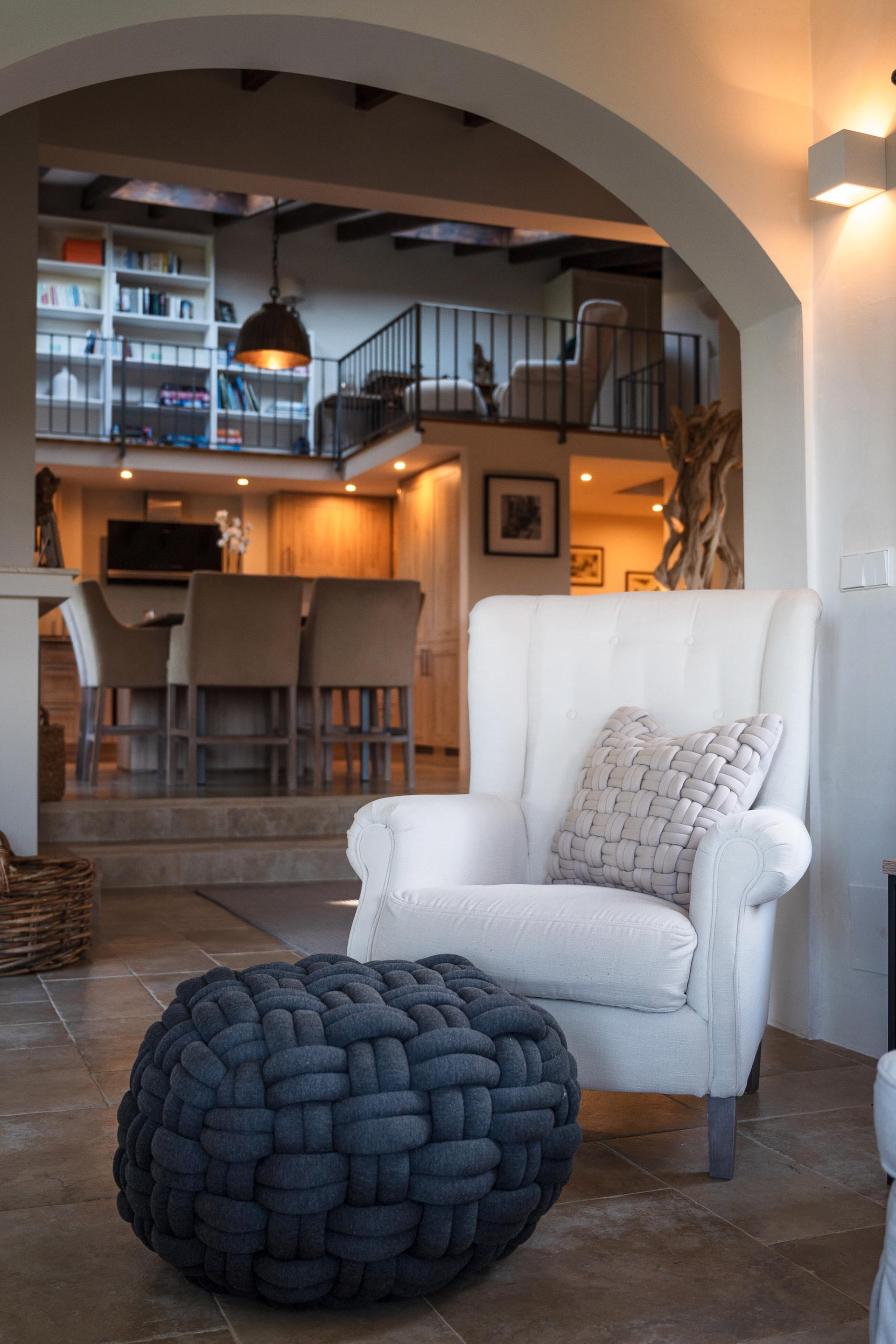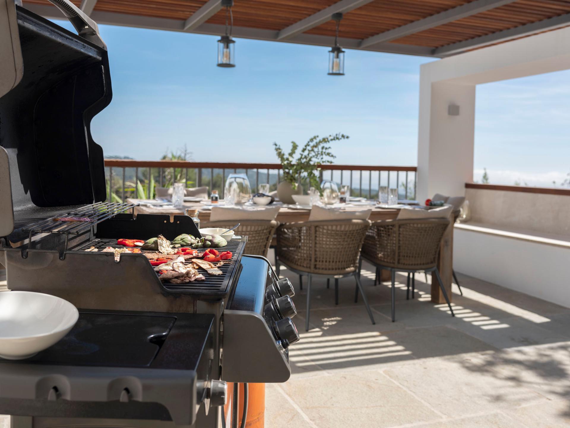 At the heart of the villa lies the open-plan kitchen and dining area, fully equipped with high-end appliances and everything needed for a gourmet experience. The dining table comfortably seats eight, while in the tower annex there is a cozy lounge with a fireplace. A mezzanine library accessed by stairs provides an inviting space to unwind and enjoy quiet leisure time. The adjacent, partially covered terrace invites you to savour al fresco dining bathed in the golden light of the Tramuntana mountains, while a more private outdoor corner with a barbecue and additional seating provides the perfect setting for relaxed moments or convivial gatherings.