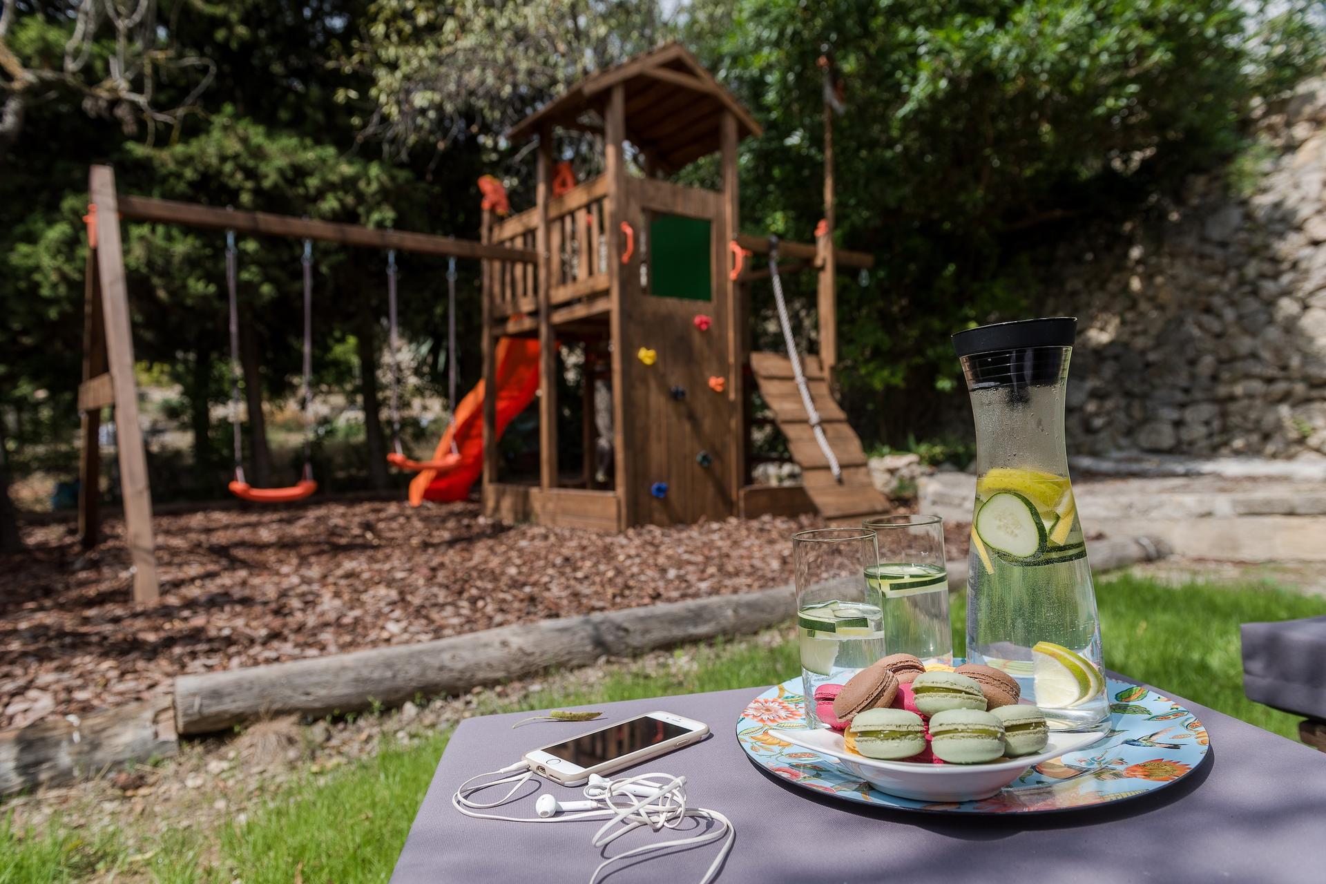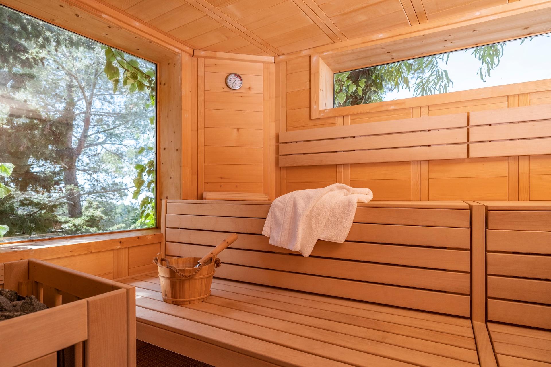 Outside, the villa reveals its full charm: a heatable saltwater pool with sweeping panoramic views, a spacious sauna, a private gym, and numerous inviting spots to read, relax, or simply soak in the natural beauty around you. Children will discover their own little paradise with a playground, sandpit, swings, toys, games, and a sports area with football goals.