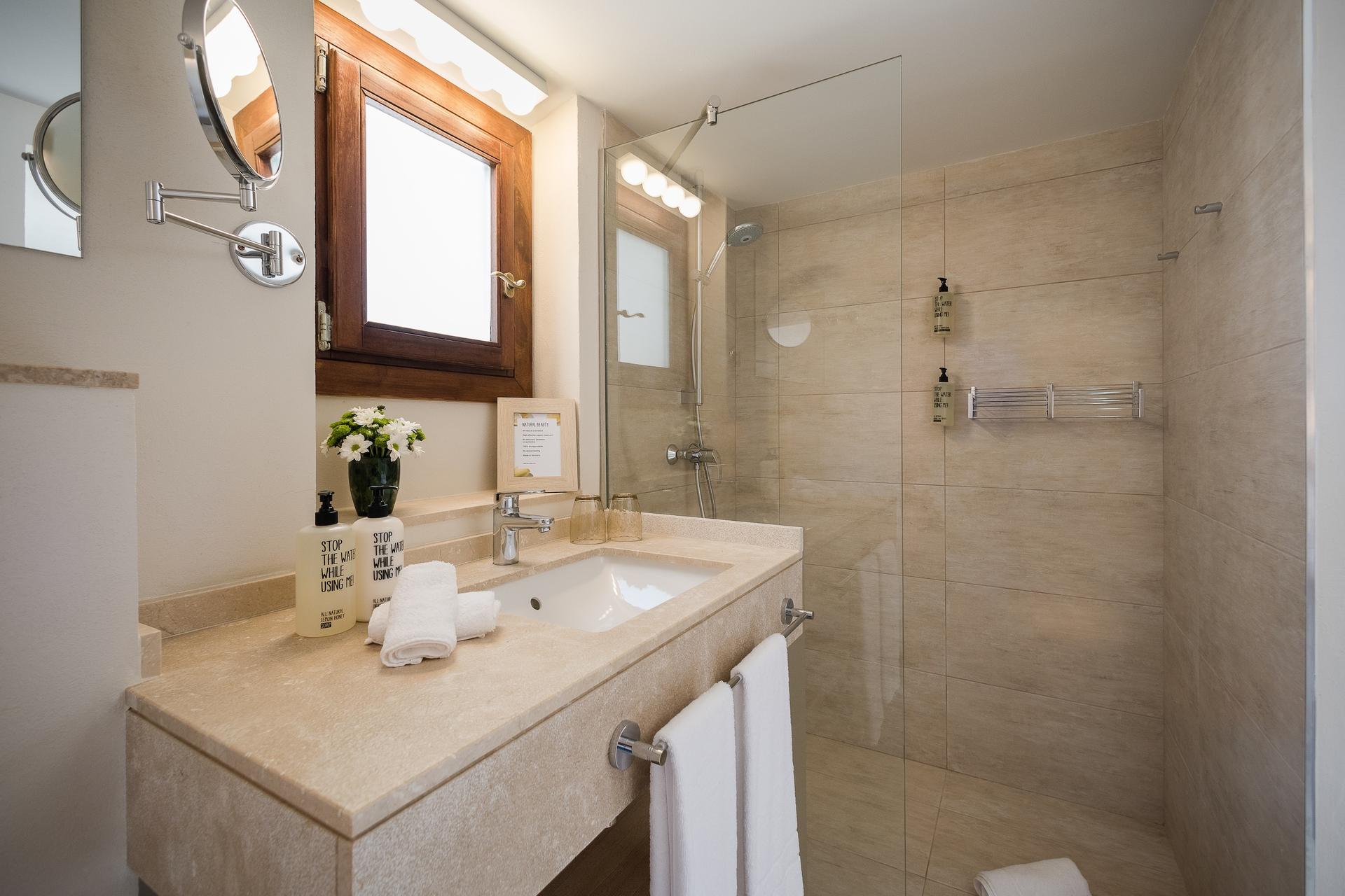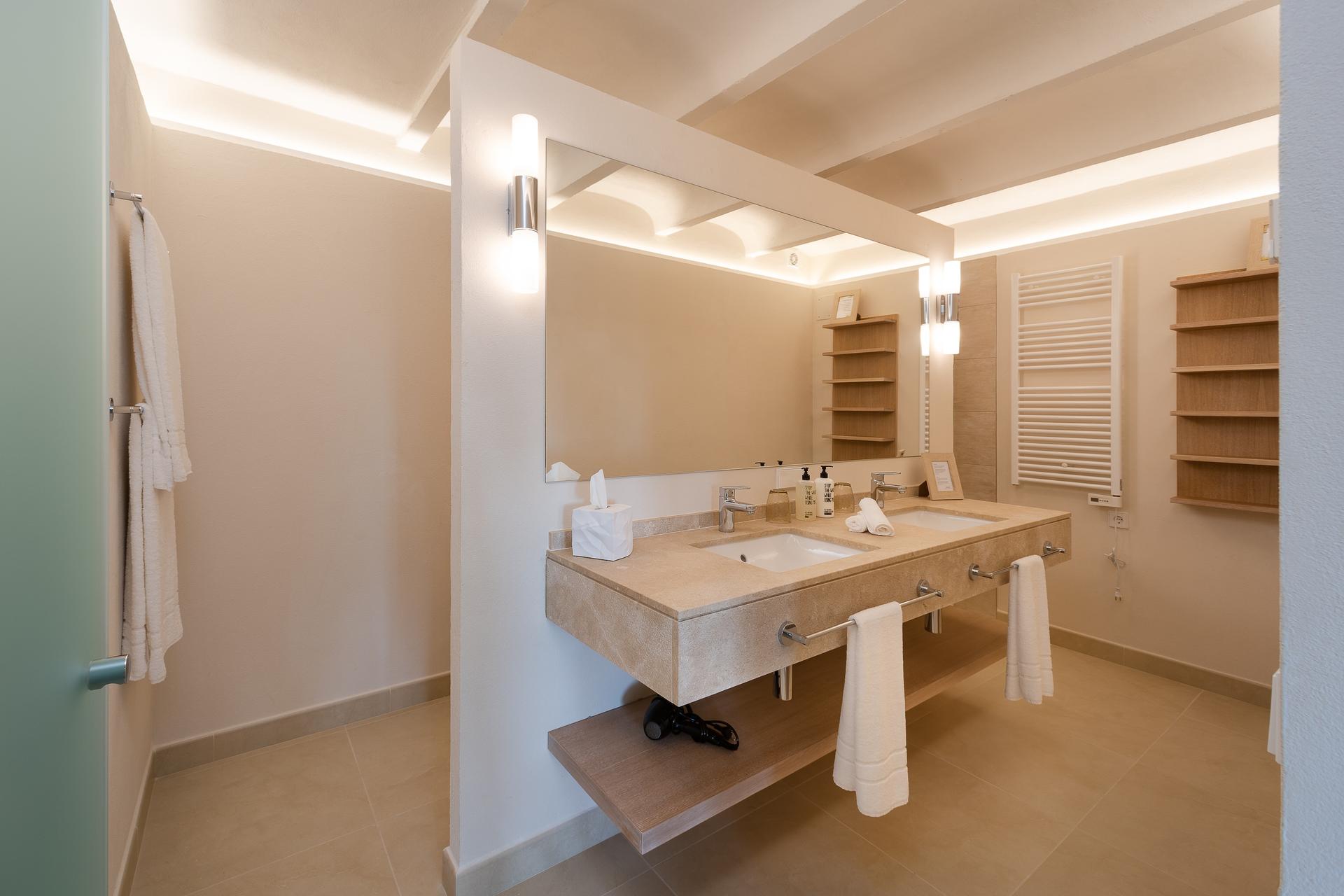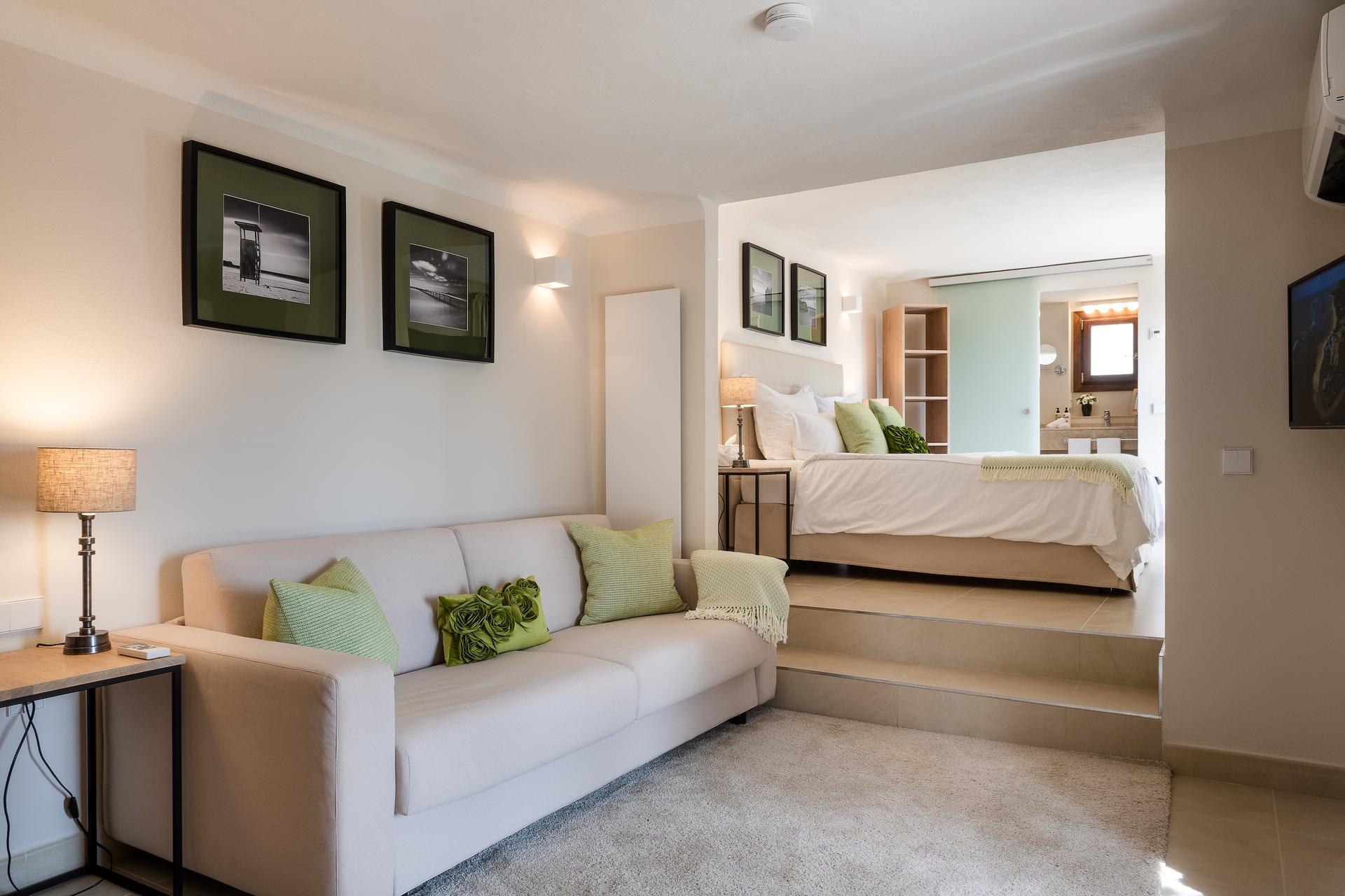 On the upper floor, the first suite includes a double bed, a sofa bed, and a private south-facing terrace. On the ground floor, a spacious second suite spread across two levels features a king bed, an additional sofa bed, and direct access to the pool area, along with two bathrooms, ideal for more space and privacy. Designed with families in mind, the third and fourth bedrooms are thoughtfully interconnected, with access to the fourth through the third. This arrangement creates a charming and practical retreat for children, where they can enjoy both comfort and a gentle sense of independence. Every bedroom has been thoughtfully furnished with premium beds and linens and equipped with refined amenities for a seamless and relaxing stay.
