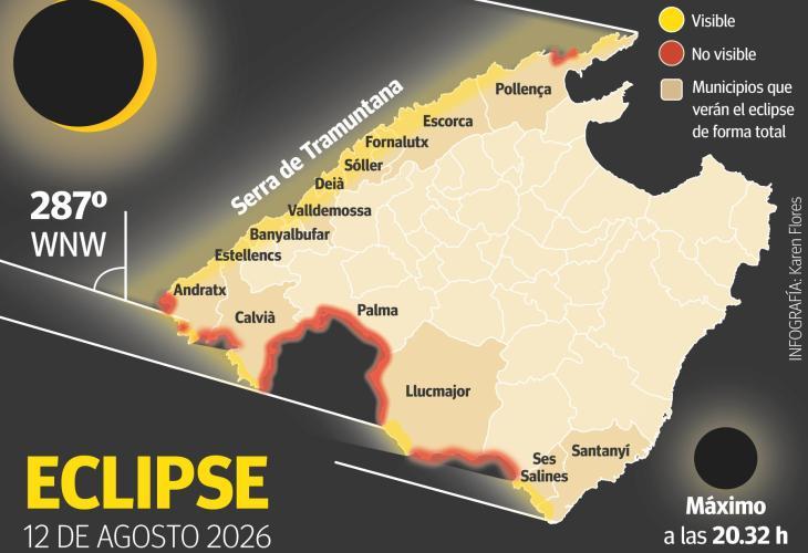 The Serra de Tramuntana will be one of the best spots to witness the phenomenon, as will parts of the southwest coast, including areas of Andratx and Calvià, between Cap de Regana and Cap Blanc (Llucmajor), and from Colònia de Sant Jordi (Ses Salines) to Cap Salines (Santanyí). Sant Elm, in Andratx, faces an obstacle in Sa Dragonera, whose height and proximity to Mallorca’s coast will block the full view of the eclipse. Likewise, Palma’s coastline will not offer visibility of the eclipse’s peak.